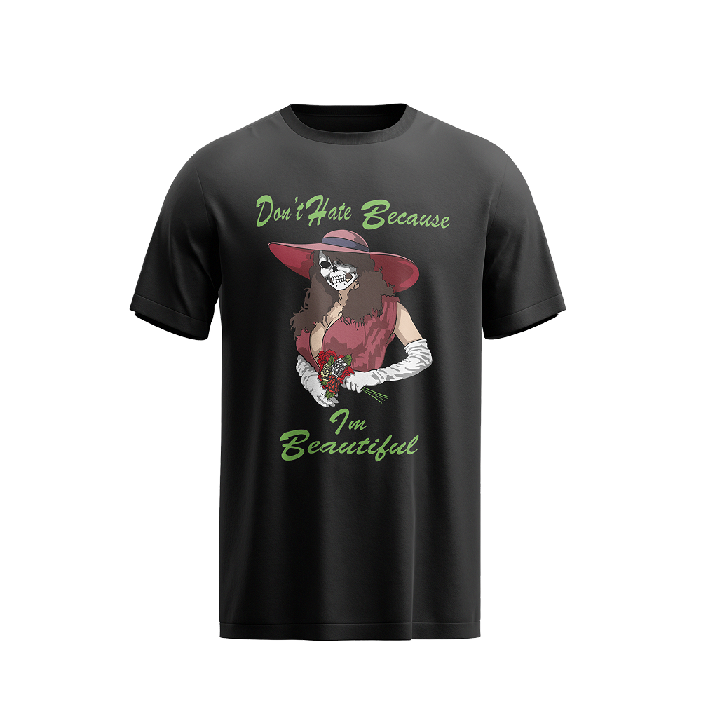 Product Description: Reclaim beauty on your terms. This black tee wears fierce grace, skeleton in red, roses...